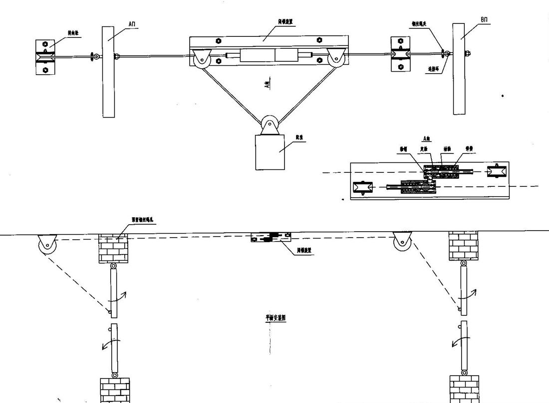 機械閉鎖裝置是怎么工作的呢?機械閉鎖裝置主要是用于兩道無壓風(fēng)門的,當A門開啟時帶動鋼絲繩移動,固定在鋼絲繩上的定軸隨之移動,彈簧伸長將動軸頂起,動軸將軸銷推到另一側(cè),軸銷將與B門相連的鋼絲繩上的定軸固定,B門不能開啟。當A門關(guān)閉時,配重帶動鋼絲繩向回移動,定軸將動軸壓回原位,軸銷可以移動,B門解鎖。同理,B門開啟時,A門也不能開啟。